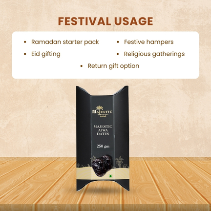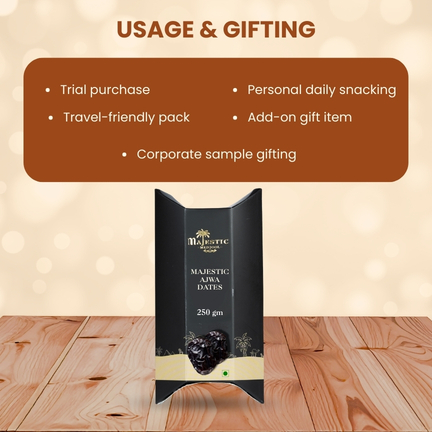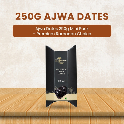 Majestic Medjool 250g Ajwa Dates Mini Pack is perfect for first-time buyers and gifting. Sourced from premium farms, these dates are soft, naturally sweet, and nutritionally rich. This compact pack is convenient for travel, small families, or as an elegant gift addition during festive occasions.