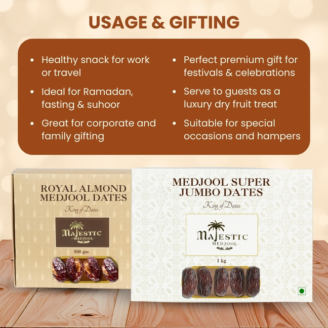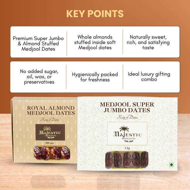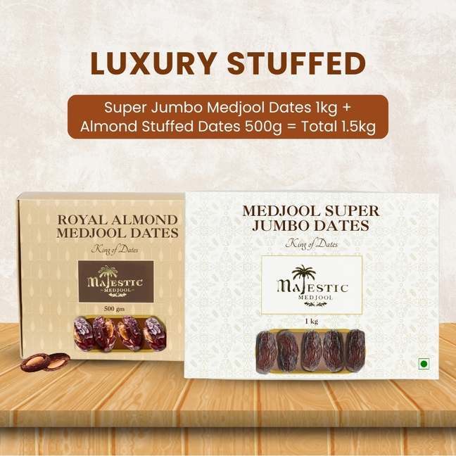 The Luxury Stuffed Combo is designed for those who want pure indulgence with added nutrition. This box combines Super Jumbo Medjool Dates (1kg) for everyday premium consumption and Almond Stuffed Medjool Dates (500g) for a rich, gourmet experience.